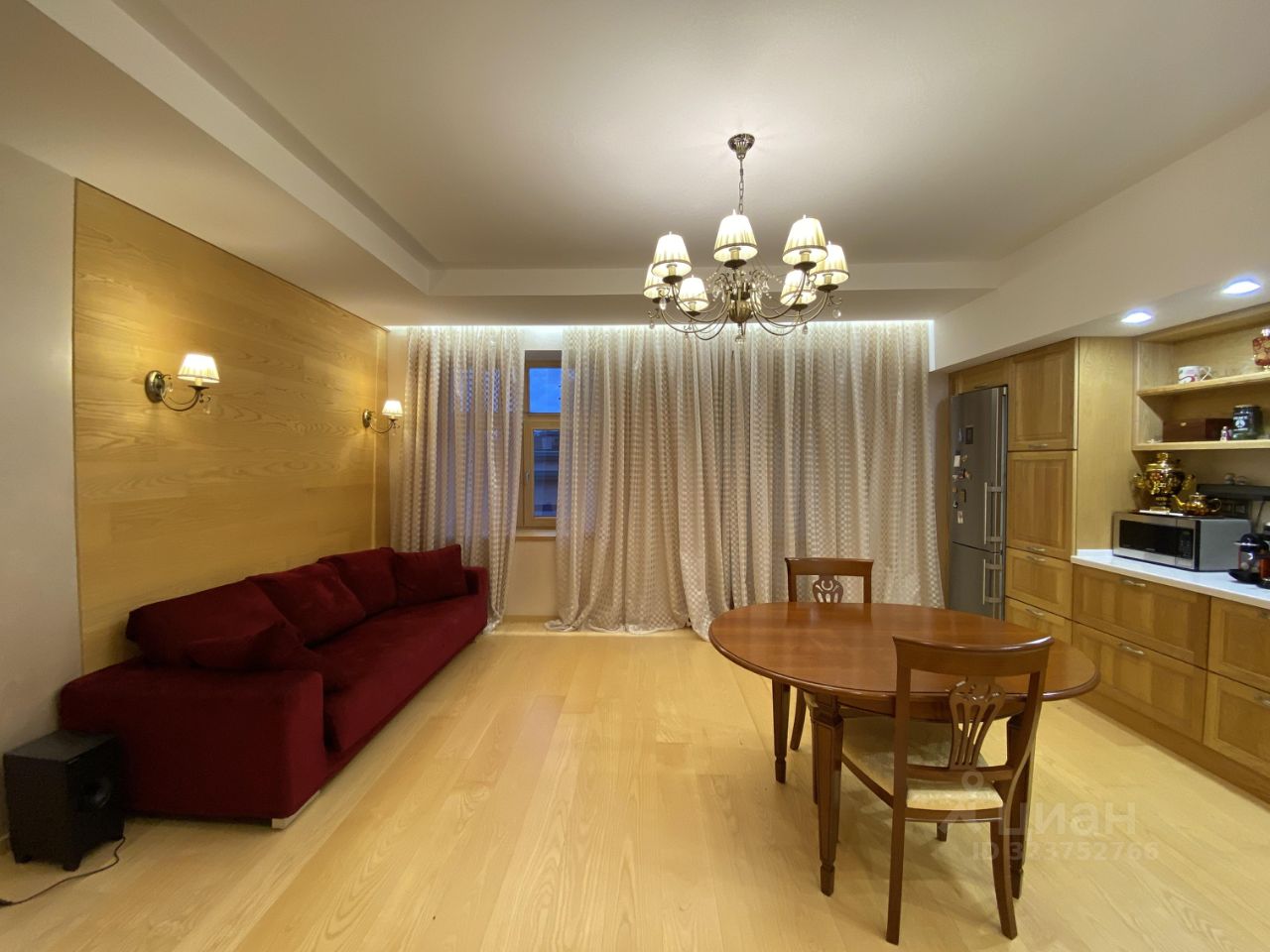 Отделка и оснащение:натуральный паркет; индивидуальные изделия из массива ценных пород дерева — кухня, декоративные панели, двери, подоконники и встроенная мебель выполнены по индивидуальному проекту. Умный дом для управления освещением с пультов и мобильных устройств; свет по датчикам движения в проходных зонах. Бытовая техника Electrolux, Smeg. Сантехника Villeroy & Boch, Cezares, Kludi. В каждом санузле — гигиенический душ. Установлены датчики протечки воды.