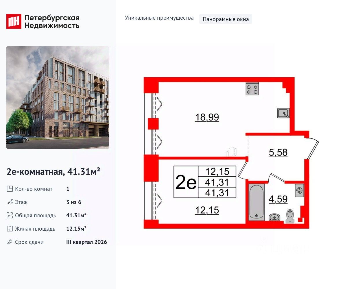 Уникальная, функциональная европланировка, большая кухня-гостиная 18.99 м², просторная прихожая 5.58 м². Общая площадь квартиры - 41.31 м², жилая 12.15 м², высота потолка 3 м.