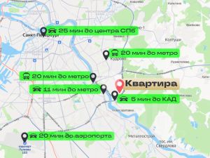 В 5 минутах от дома выезд на КАД. 25 минут на авто до центра города, 20 минут до аэропорта.