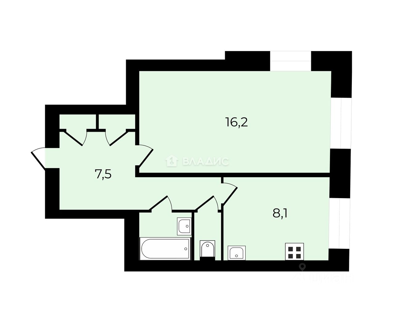 -Комната жилая правильной формы 16,2 м²;