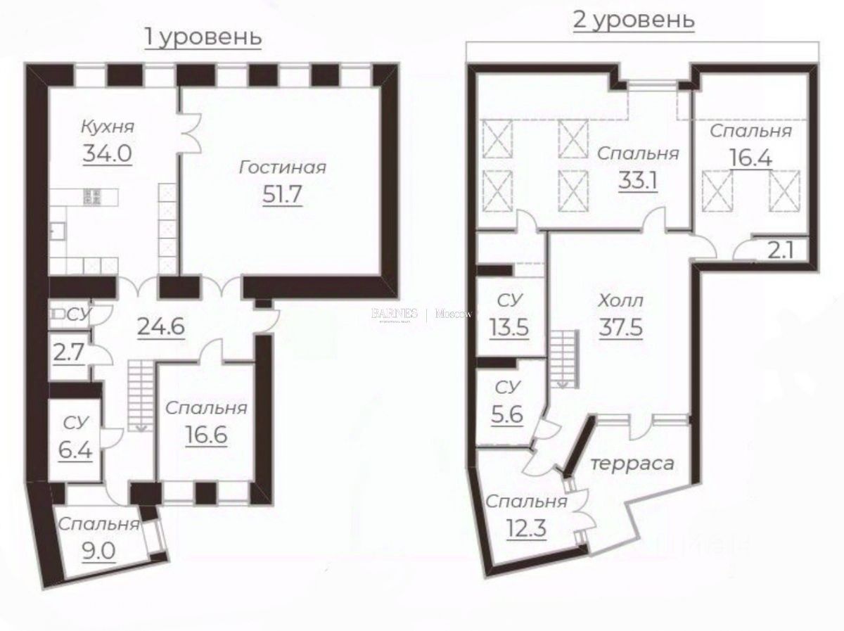 На 2 уровне расположилась приватная часть квартиры, включающая в себя три спальни. А так же просторная терраса — это ваше личное пространство для отдыха на свежем воздухе, где можно наслаждаться утренним кофе или вечерними закатами. В квартире 4 санузла, что очень комфортно для большой семьи.