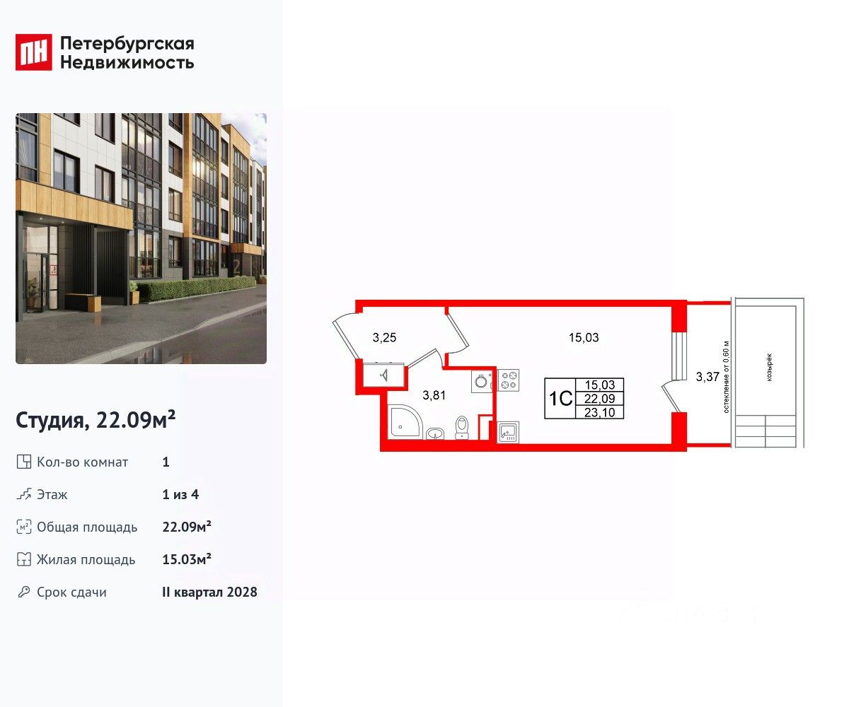 Удобная, классическая, функциональная европланировка, просторная прихожая 3.25 м². Общая площадь студии - 22.09 м², жилая 15.03 м², высота потолка 2.77 м.