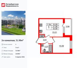 Удобная, классическая, функциональная европланировка, большая кухня-гостиная 15.01 м², вместительная прихожая 3.61 м². Общая площадь квартиры - 31.98 м², жилая 10.09 м², высота потолка 3.07 м.