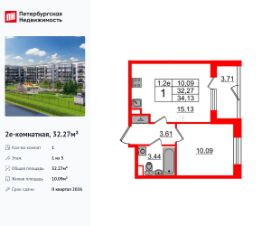 Удобная, классическая, функциональная европланировка, большая кухня-гостиная 15.13 м², вместительная прихожая 3.61 м². Общая площадь квартиры - 32.27 м², жилая 10.09 м², высота потолка 2.77 м.