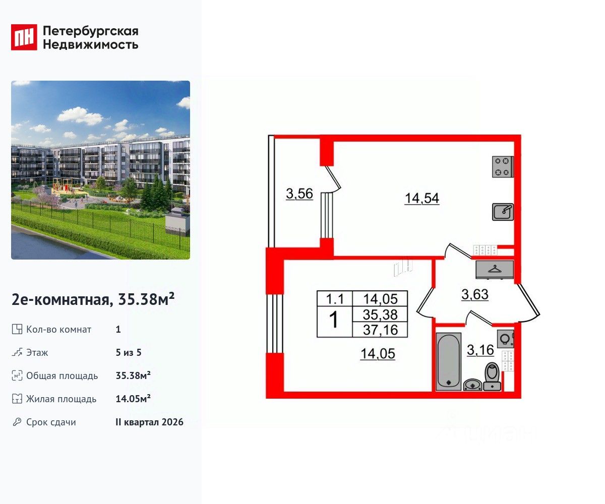 Удобная, классическая, функциональная европланировка, большая кухня-гостиная 14.54 м², вместительная прихожая 3.63 м². Общая площадь квартиры - 35.38 м², жилая 14.05 м², высота потолка 3.07 м.