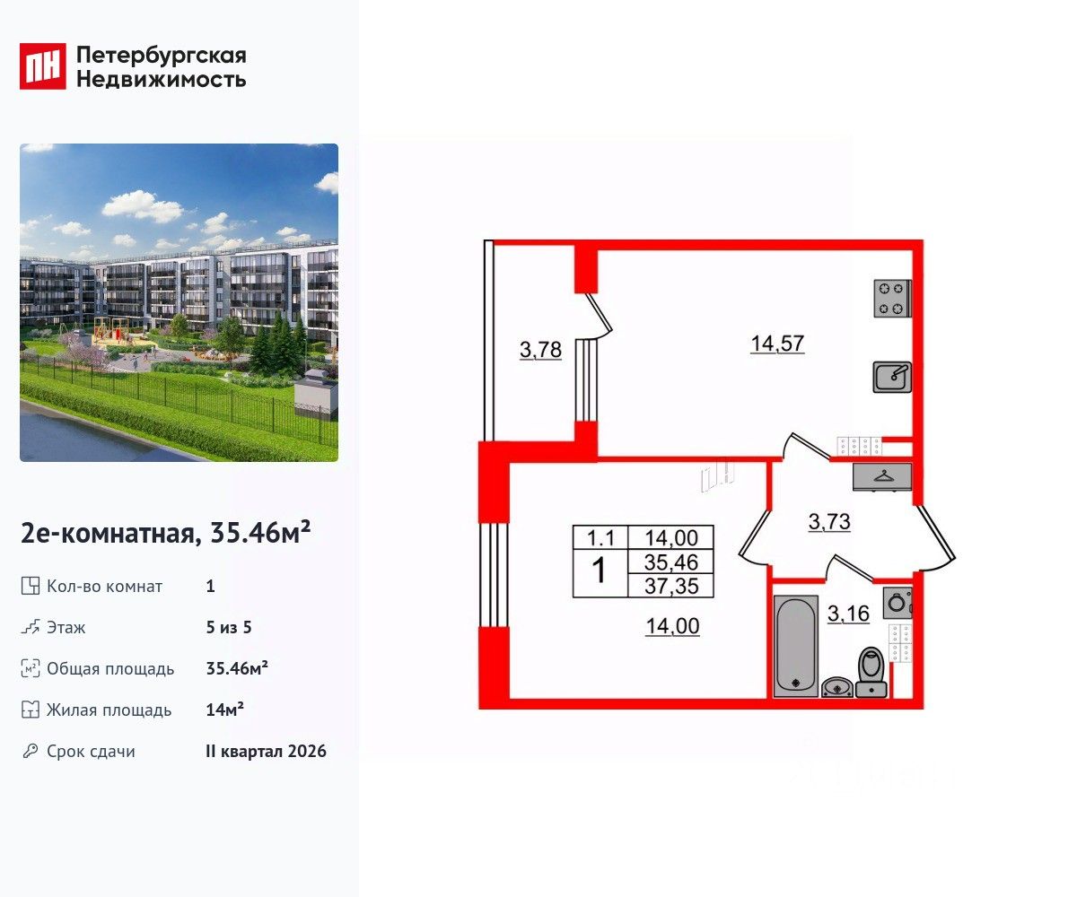 Удобная, классическая, функциональная европланировка, большая кухня-гостиная 14.57 м², вместительная прихожая 3.73 м². Общая площадь квартиры - 35.46 м², жилая 14 м², высота потолка 3.07 м.