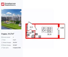 Удобная, классическая, функциональная европланировка, вместительная прихожая 3.11 м². Общая площадь студии - 24.27 м², жилая 18.14 м², высота потолка 3.07 м.