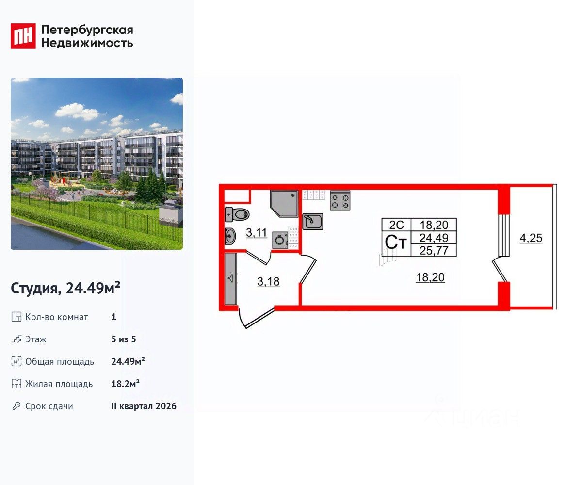 Удобная, классическая, функциональная европланировка, вместительная прихожая 3.18 м². Общая площадь студии - 24.49 м², жилая 18.2 м², высота потолка 3.07 м.