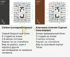Потолки 3 метра, а не 2.8, как в Titan; премиальная архитектура фасадов; корпус расположен на стилобате, а не на земле - это улучшает виды, акустику и приватность