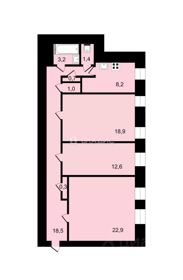 Квартира с 3-мя изолированными комнатами 12,6, 18,9 и 22,9 кв.м, из окон вид во двор, высота потолков 2,97 м, кухня 8,2 кв.м, санузел раздельный.