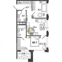 Квартира находится на 11/13 этаже. Общая площадь квартиры 60.7 м2.