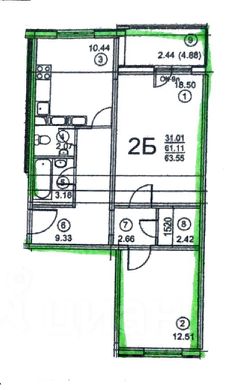 Общая площадь 61 кв. м. Кухня - 10,4 кв.м. Комнаты: 18,5 и 12,5 кв.м. Лоджия 5 кв.м. Гардеробная 2,4 кв.м. Высота потолков - 2,8 м. В доме 2 лифта: грузовой и пассажирский.