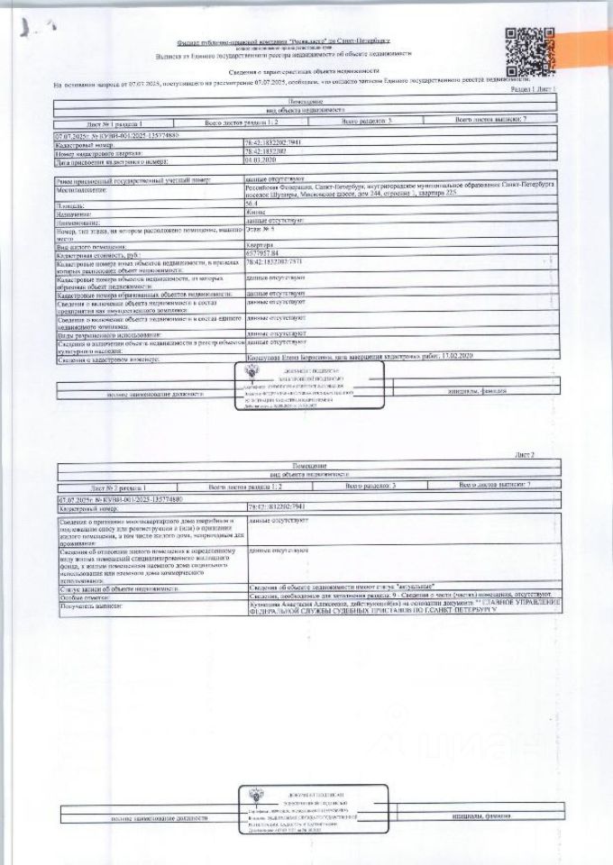 Квартира, расположенная по адресу: Санкт-Петербург, пос. Шушары, Московское шоссе, д. 244, стр. 1, кв. 225 общ. пл. 56,4 кв. м., кад. номер 78:42:1832202:9741