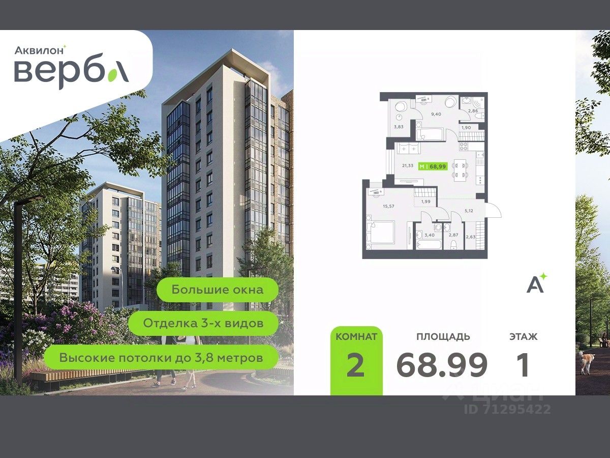 2-комн. квартира от застройщика с предчистовой отделкой в ЖК "Аквилон Верба" на 1 этаже. Общая площадь: 68.99 кв.м., площадь просторной кухни-столовой: 21.33 кв.м. Высота потолков 2.72 м.