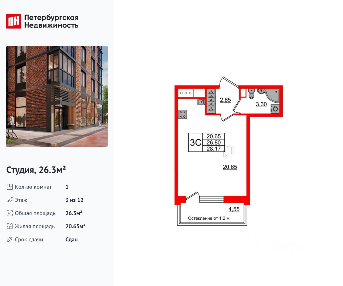 Удобная, классическая, функциональная европланировка, вместительная прихожая 2.85 м². Общая площадь студии - 26.3 м², жилая 20.65 м², высота потолка 2.77 м.