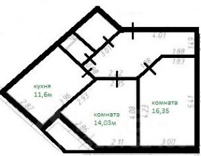 Общая площадь: 55,3 кв.м. Кухня: 11,6 кв.м. Комнаты: 16,35+14,03 кв.м.