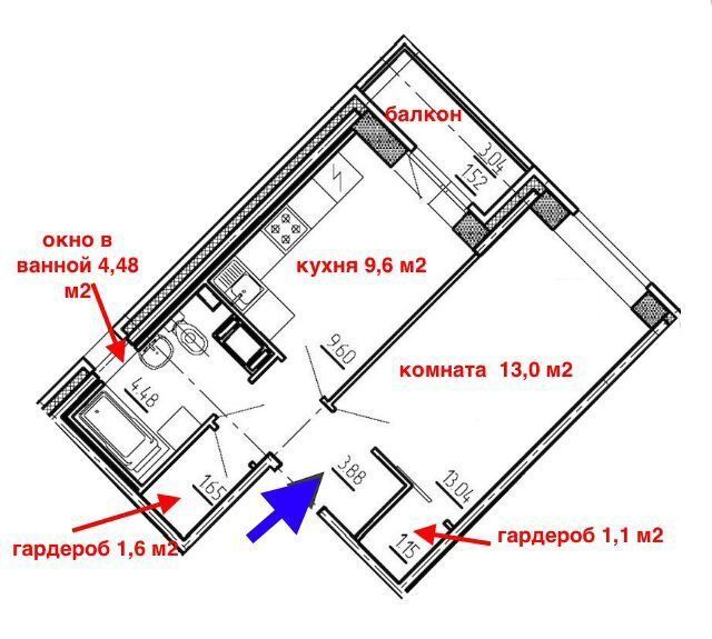 В продаже 1-комнатная квартира в ЖК Стороны света редкой планировки!