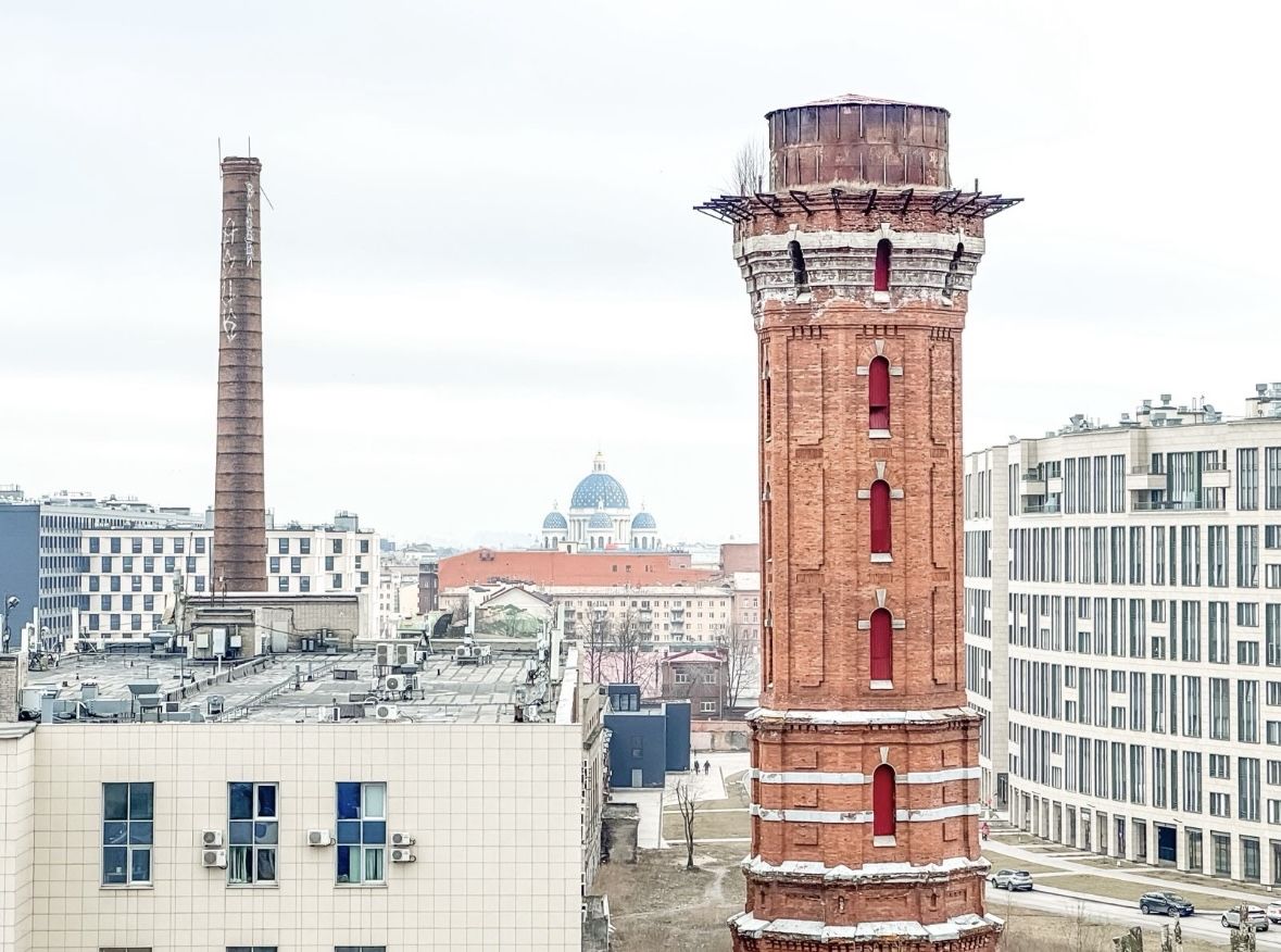 Продается просторная 2-комнатная квартира 64.4 м² на высоком 9 этаже. Главная особенность — панорамный вид на исторический центр Санкт-Петербурга, водонапорную башню 19 века, купола Троицкого собора и Лахта-центр.