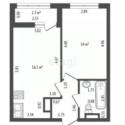 Формат 2-евро — просторная кухня-гостиная 16,5 м² и уютная спальня 14 м².