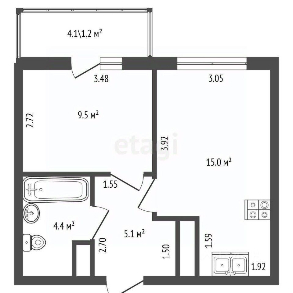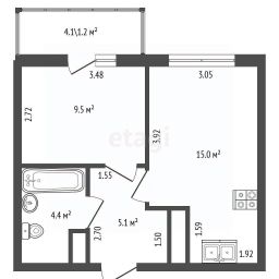 - Сан.узел 4,4 кв.м, коридор 5,1 кв.м, балкон 4,1 кв м, спальня 9,5 кв.м, кухня-гостиная - 15 кв м