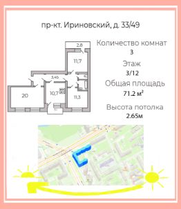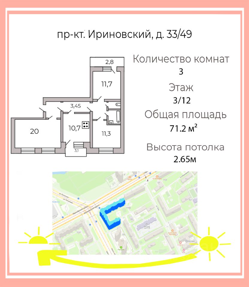 В прямой продаже двухсторонняя 3-х ккв с двумя балконами и изолированными комнатами. Один балкон выходит на большой зеленый двор с детской площадкой, второй на проспект.
