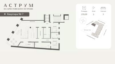 Квартира для семейного проживания площадью 233,69 кв. м расположена на 5 этаже. Проектом предусмотрены большая кухня-гостиная, кабинет, 3 мастер-спальни, 4 ванные комнаты, выделенное хозяйственное помещение. Высокие потолки 3,15 м. Установлены индивидуальные системы кондиционирования и вентиляции, выделена увеличенная мощность электроснабжения. В подземном паркинге можно приобрести парковочные места.