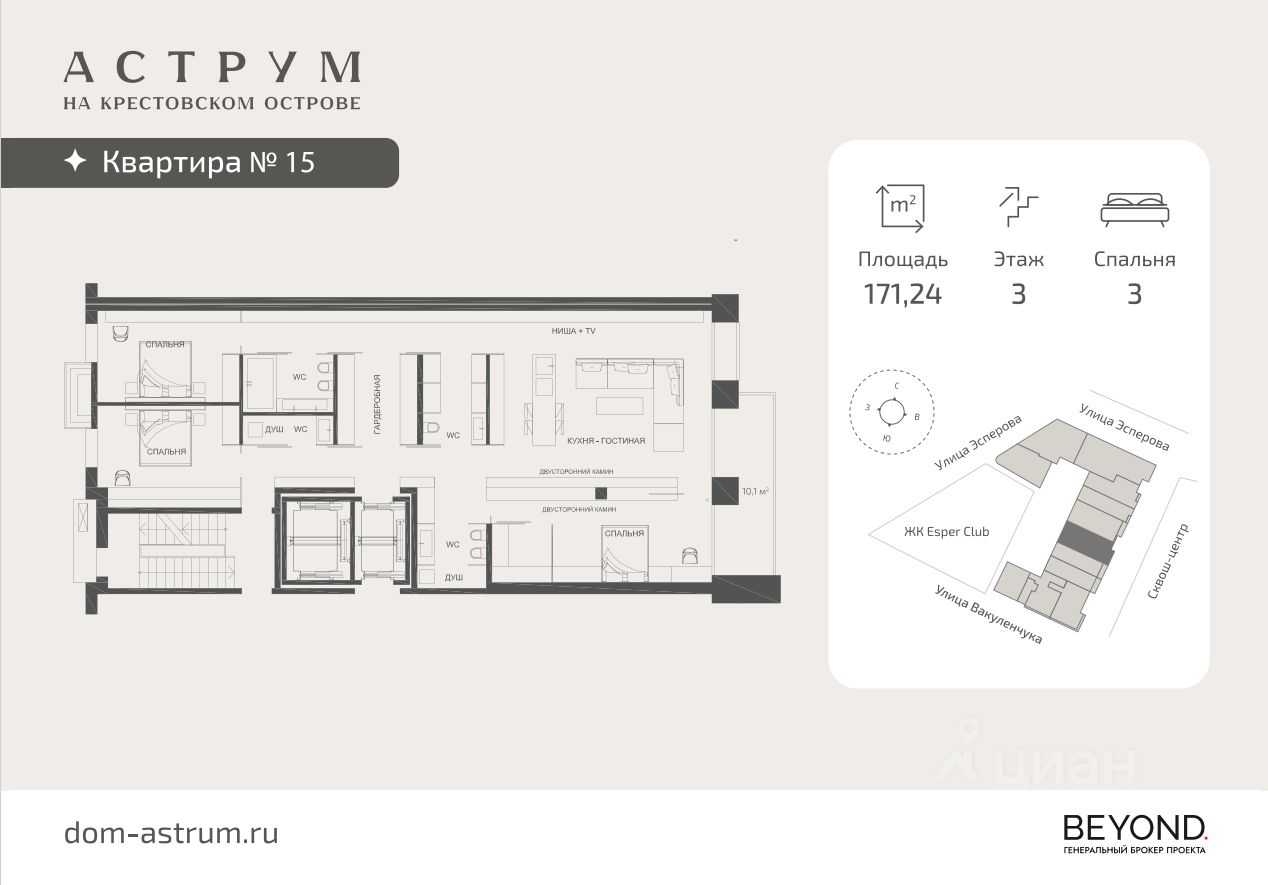 Квартира для семейного проживания площадью 172,43 кв. м расположена на 4 этаже и имеет детально продуманную планировку. Высокие потолки 3,15 м, панорамные окна в пол, кухня-гостиная, 3 мастер-спальни, 4 ванные комнаты, выделенное хозяйственное помещение. Две детских спальни выходят в вечнозеленый внутренний двор. Предусмотрены индивидуальные системы кондиционирования и вентиляции, выделена увеличенная мощность электроснабжения. В подземном паркинге можно приобрести парковочное место. Один из самых статусных новых домов Санкт-Петербурга — Аструм, расположен в самой тихой части Крестовского острова, вдали от людей и машин, в шаге от набережной Средней Невки, Приморского парка Победы и парков на Елагином острове. Неподалеку разбит приятный для неспешных прогулок "Фруктовый сад" с яблонями, грушами, вишней и сиренью.