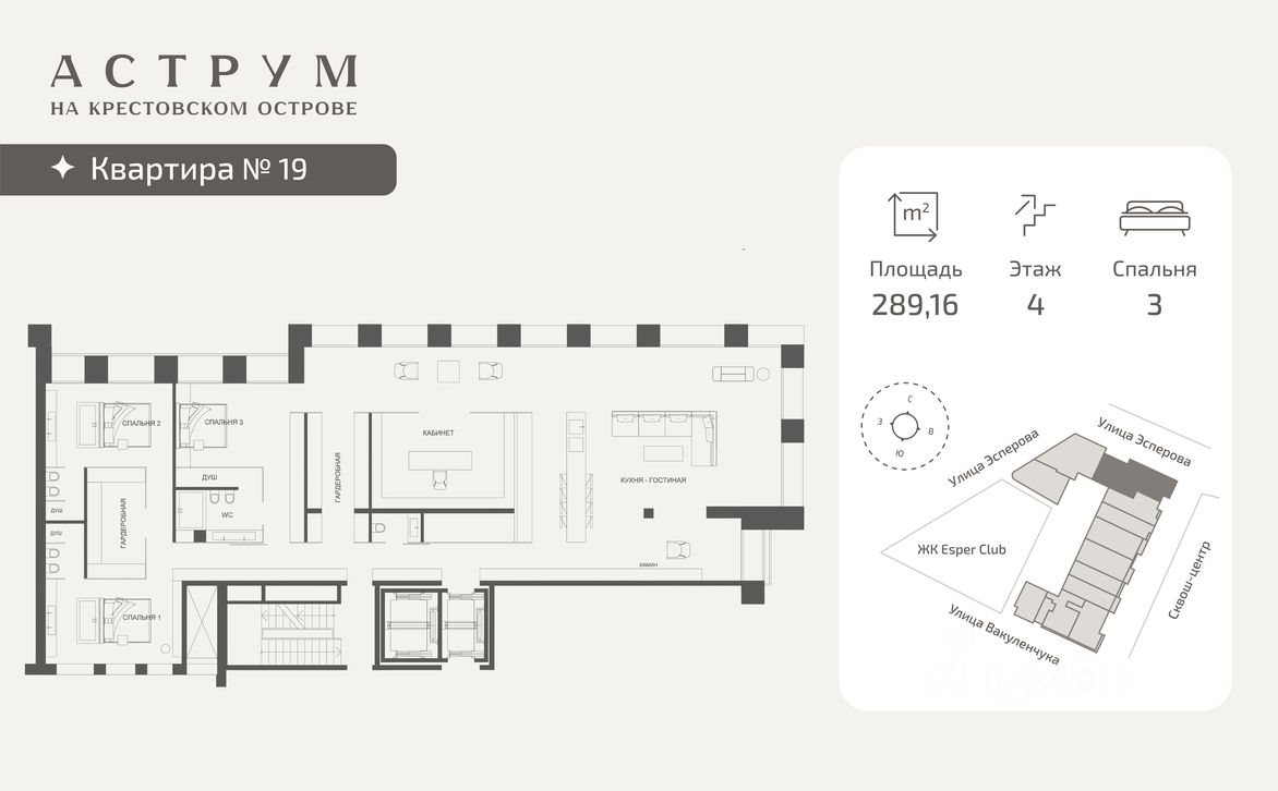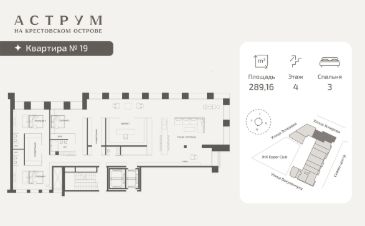 Уникальная резиденция площадью 310,91 кв. м в стиле сити-хаус расположена на 1 этаже и имеет два собственных патио. Одно из них выходит в вечнозеленый внутренний двор с гипоаллергенными растениями, второе, площадью 110 кв.м в закрытое пространство у дома. Высокие потолки 3,3 м, панорамные окна в пол, кухня-гостиная, 4 мастер-спальни, 5 ванных комнат, выделенное хозяйственное помещение. Предусмотрены индивидуальные системы кондиционирования и вентиляции, выделена увеличенная мощность электроснабжения. В подземном паркинге можно приобрести парковочное место. Один из самых статусных новых домов Санкт-Петербурга — Аструм, расположен в самой тихой части Крестовского острова, вдали от людей и машин, в шаге от набережной Средней Невки, Приморского парка Победы и парков на Елагином острове. Неподалеку разбит приятный для неспешных прогулок "Фруктовый сад" с яблонями, грушами, вишней и сиренью.