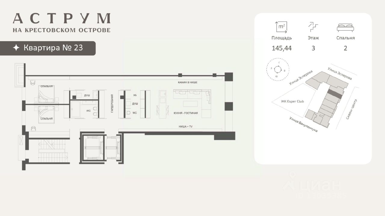 Квартира для семейного проживания площадью 145,44 кв. м расположена на 3 этаже и имеет детально продуманную планировку. Высокие потолки 3,15 м, панорамные окна в пол, кухня-гостиная, 2 мастер-спальни, 3 ванные комнаты, выделенное хозяйственное помещение. Две детских спальни выходят в вечнозеленый внутренний двор. Предусмотрены индивидуальные системы кондиционирования и вентиляции, выделена увеличенная мощность электроснабжения. В подземном паркинге можно приобрести парковочное место. Один из самых статусных новых домов Санкт-Петербурга — Аструм, расположен в самой тихой части Крестовского острова, вдали от людей и машин, в шаге от набережной Средней Невки, Приморского парка Победы и парков на Елагином острове. Неподалеку разбит приятный для неспешных прогулок "Фруктовый сад" с яблонями, грушами, вишней и сиренью.