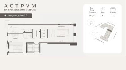 Квартира для семейного проживания площадью 145,32 кв. м расположена на 4 этаже и имеет детально продуманную планировку. Высокие потолки 3,15 м, панорамные окна в пол, кухня-гостиная, 2 мастер-спальни, 3 ванные комнаты, выделенное хозяйственное помещение. Две детских спальни выходят в вечнозеленый внутренний двор. Предусмотрены индивидуальные системы кондиционирования и вентиляции, выделена увеличенная мощность электроснабжения. В подземном паркинге можно приобрести парковочное место. Один из самых статусных новых домов Санкт-Петербурга — Аструм, расположен в самой тихой части Крестовского острова, вдали от людей и машин, в шаге от набережной Средней Невки, Приморского парка Победы и парков на Елагином острове. Неподалеку разбит приятный для неспешных прогулок "Фруктовый сад" с яблонями, грушами, вишней и сиренью.
