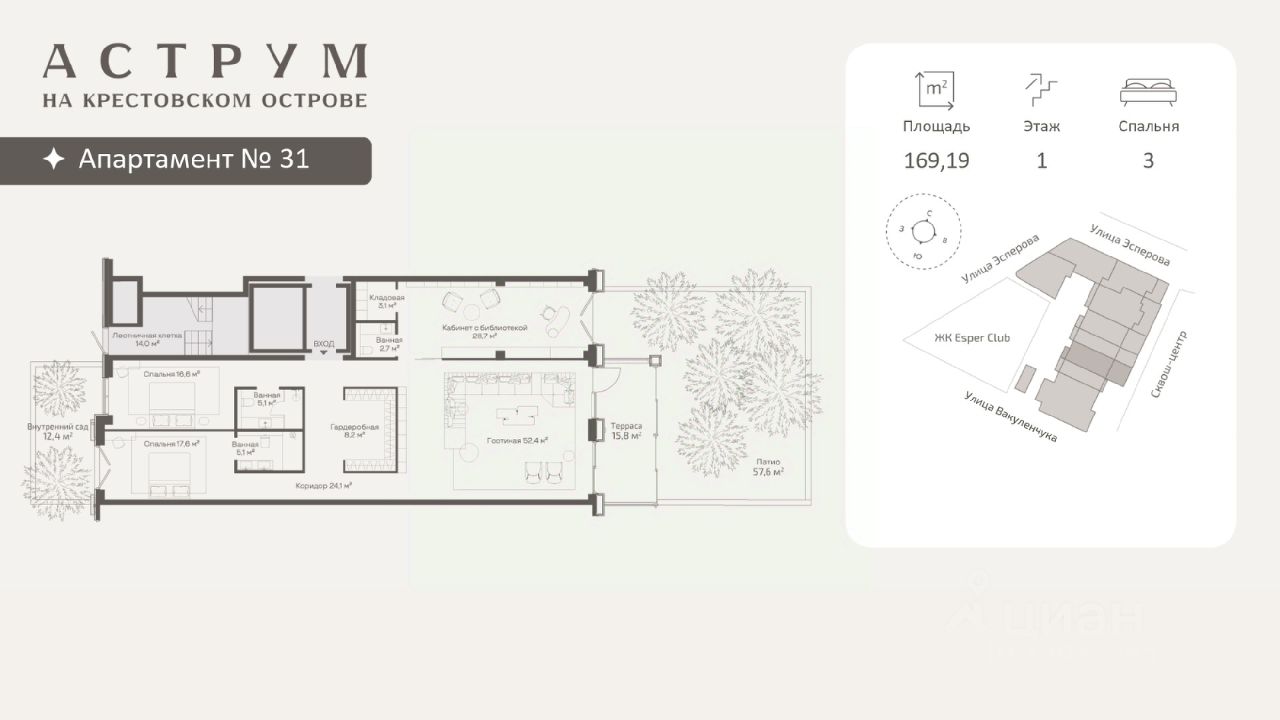 Уникальная резиденция площадью 169,19 кв. м в стиле сити-хаус расположена на 1 этаже и имеет два собственных патио. Одно из них выходит в вечнозеленый внутренний двор с гипоаллергенными растениями, второе, площадью 70 кв.м в закрытое пространство у дома. Высокие потолки 3,3 м, панорамные окна в пол, кухня-гостиная, 3 мастер-спальни, 4 ванные комнаты, выделенное хозяйственное помещение. Предусмотрены индивидуальные системы кондиционирования и вентиляции, выделена увеличенная мощность электроснабжения. В подземном паркинге можно приобрести парковочное место. Один из самых статусных новых домов Санкт-Петербурга — Аструм, расположен в самой тихой части Крестовского острова, вдали от людей и машин, в шаге от набережной Средней Невки, Приморского парка Победы и парков на Елагином острове. Неподалеку разбит приятный для неспешных прогулок "Фруктовый сад" с яблонями, грушами, вишней и сиренью.