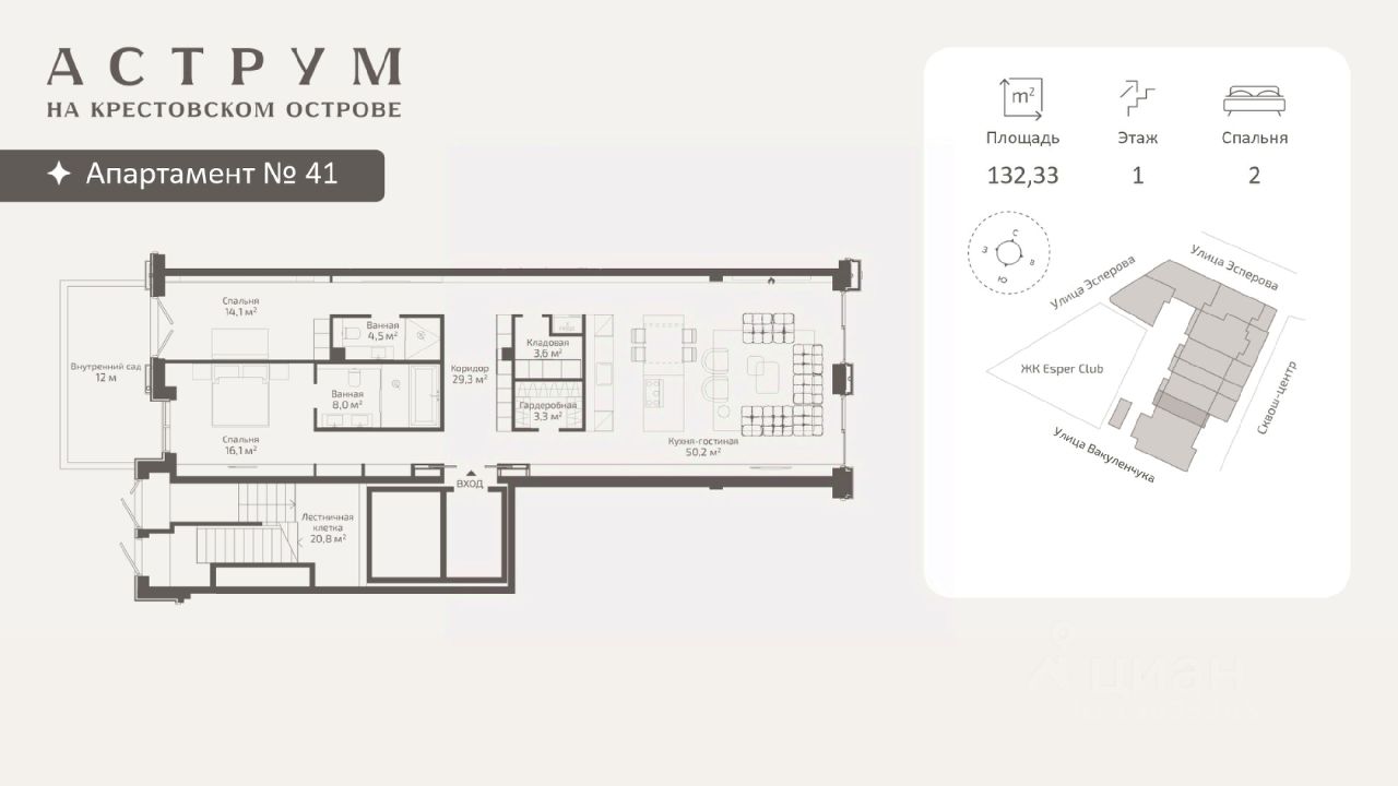 Резиденция площадью 132,33 кв. м в стиле сити-хаус расположена на 1 этаже и имеет собственные патио 50 кв.м и 12 кв.м в закрытом пространстве дома. Высокие потолки 3,3 м, панорамные окна в пол, кухня-гостиная, 2 мастер-спальни, 3 ванные комнаты, выделенное хозяйственное помещение. Предусмотрены индивидуальные системы кондиционирования и вентиляции, выделена увеличенная мощность электроснабжения. В подземном паркинге можно приобрести парковочное место. Один из самых статусных новых домов Санкт-Петербурга — Аструм, расположен в самой тихой части Крестовского острова, вдали от людей и машин, в шаге от набережной Средней Невки, Приморского парка Победы и парков на Елагином острове. Неподалеку разбит приятный для неспешных прогулок "Фруктовый сад" с яблонями, грушами, вишней и сиренью.