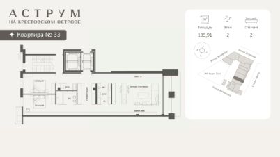 Квартира для семейного проживания площадью 132,91 кв. м расположена на 2 этаже и имеет детально продуманную планировку. Высокие потолки 3,15 м, панорамные окна в пол, балкон, кухня-гостиная, 2 мастер-спальни, 3 ванные комнаты, выделенное хозяйственное помещение. Две детских спальни выходят в вечнозеленый внутренний двор. Предусмотрены индивидуальные системы кондиционирования и вентиляции, выделена увеличенная мощность электроснабжения. В подземном паркинге можно приобрести парковочное место. Один из самых статусных новых домов Санкт-Петербурга — Аструм, расположен в самой тихой части Крестовского острова, вдали от людей и машин, в шаге от набережной Средней Невки, Приморского парка Победы и парков на Елагином острове. Неподалеку разбит приятный для неспешных прогулок "Фруктовый сад" с яблонями, грушами, вишней и сиренью.