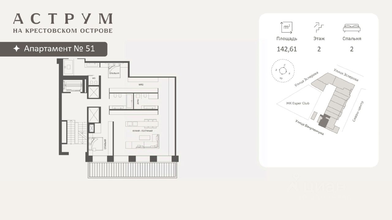 Апартамент площадью 142,61 кв. м расположен на 2 этаже и имеет собственную террасу 23,8 кв.м. Высокие потолки 3,15 м, панорамные окна в пол, кухня-гостиная, 2 мастер-спальни, 3 ванные комнаты, выделенное хозяйственное помещение. Предусмотрены индивидуальные системы кондиционирования и вентиляции, выделена увеличенная мощность электроснабжения. В подземном паркинге можно приобрести парковочное место. Один из самых статусных новых домов Санкт-Петербурга — Аструм, расположен в самой тихой части Крестовского острова, вдали от людей и машин, в шаге от набережной Средней Невки, Приморского парка Победы и парков на Елагином острове. Неподалеку разбит приятный для неспешных прогулок "Фруктовый сад" с яблонями, грушами, вишней и сиренью.