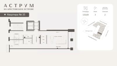 Квартира для семейного проживания площадью 133,83 кв. м расположена на 3 этаже и имеет детально продуманную планировку. Высокие потолки 3,15 м, панорамные окна в пол, лоджия, кухня-гостиная, 2 мастер-спальни, 3 ванные комнаты, выделенное хозяйственное помещение. Две детских спальни выходят в вечнозеленый внутренний двор. Предусмотрены индивидуальные системы кондиционирования и вентиляции, выделена увеличенная мощность электроснабжения. В подземном паркинге можно приобрести парковочное место. Один из самых статусных новых домов Санкт-Петербурга — Аструм, расположен в самой тихой части Крестовского острова, вдали от людей и машин, в шаге от набережной Средней Невки, Приморского парка Победы и парков на Елагином острове. Неподалеку разбит приятный для неспешных прогулок "Фруктовый сад" с яблонями, грушами, вишней и сиренью.