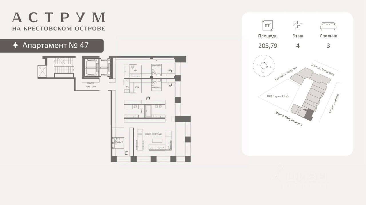 Апартамент площадью 205,79 кв. м расположен на 4 этаже с окнами на южную сторону. Высокие потолки 3,15 м, панорамные окна в пол, лоджия, кухня-гостиная, 3 мастер-спальни, 4 ванные комнаты, выделенное хозяйственное помещение. Предусмотрены индивидуальные системы кондиционирования и вентиляции, выделена увеличенная мощность электроснабжения. В подземном паркинге можно приобрести парковочное место. Один из самых статусных новых домов Санкт-Петербурга — Аструм, расположен в самой тихой части Крестовского острова, вдали от людей и машин, в шаге от набережной Средней Невки, Приморского парка Победы и парков на Елагином острове. Неподалеку разбит приятный для неспешных прогулок "Фруктовый сад" с яблонями, грушами, вишней и сиренью.