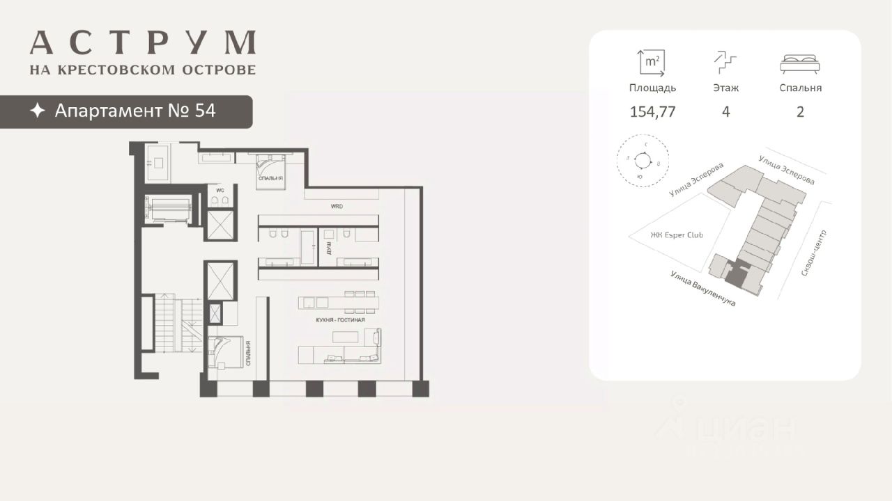 Апартамент площадью 154,77 кв. м расположен на 4 этаже с окнами на южую сторону. Высокие потолки 3,15 м, панорамные окна в пол, кухня-гостиная, 2 мастер-спальни, 3 ванные комнаты, выделенное хозяйственное помещение. Предусмотрены индивидуальные системы кондиционирования и вентиляции, выделена увеличенная мощность электроснабжения. В подземном паркинге можно приобрести парковочное место. Один из самых статусных новых домов Санкт-Петербурга — Аструм, расположен в самой тихой части Крестовского острова, вдали от людей и машин, в шаге от набережной Средней Невки, Приморского парка Победы и парков на Елагином острове. Неподалеку разбит приятный для неспешных прогулок "Фруктовый сад" с яблонями, грушами, вишней и сиренью.