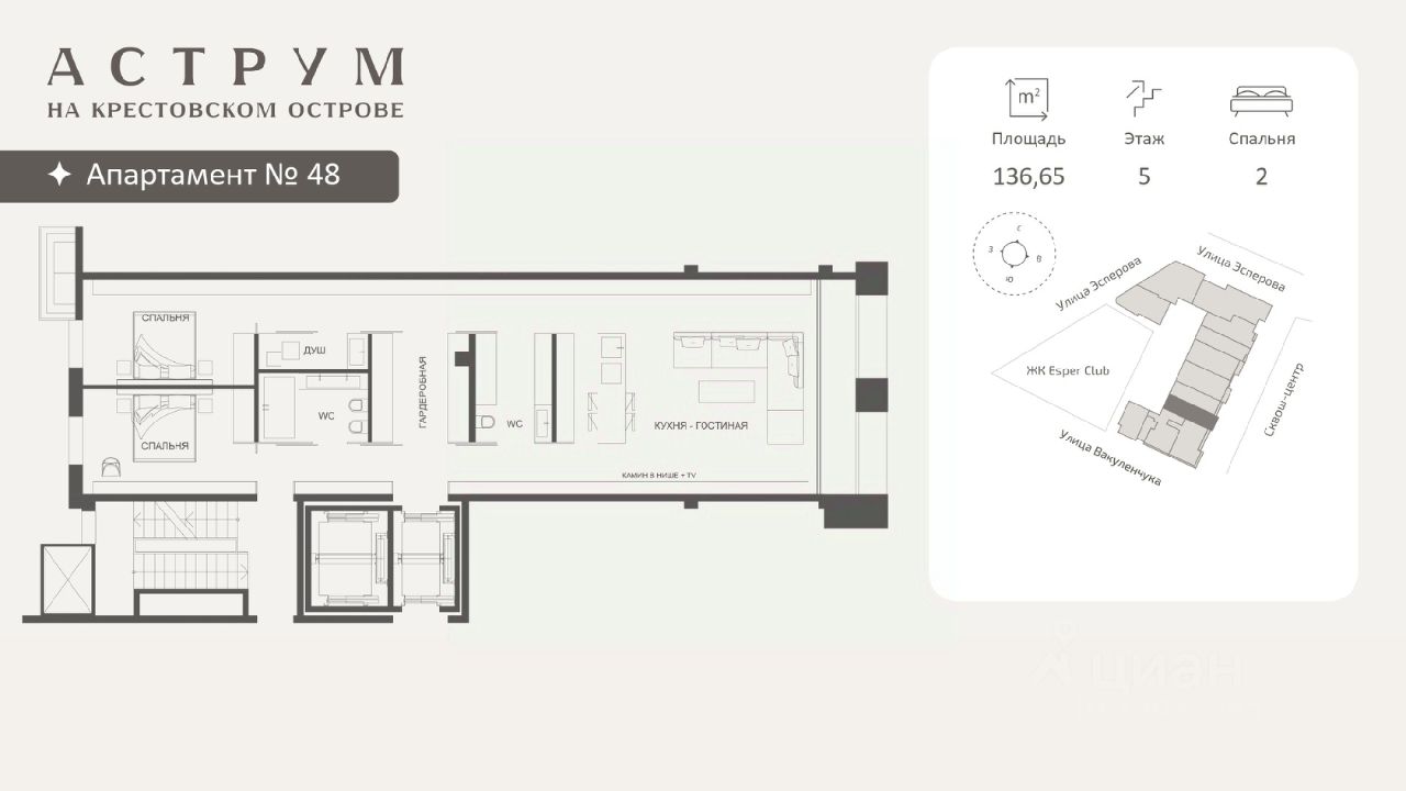 Апартамен для семейного проживания площадью 136,65 кв. м расположен на 5 этаже и имеет детально продуманную планировку. Высокие потолки 3,15 м, панорамные окна в пол, лоджия, кухня-гостиная, 2 мастер-спальни, 3 ванные комнаты, выделенное хозяйственное помещение. Две детских спальни выходят в вечнозеленый внутренний двор. Предусмотрены индивидуальные системы кондиционирования и вентиляции, выделена увеличенная мощность электроснабжения. В подземном паркинге можно приобрести парковочное место. Один из самых статусных новых домов Санкт-Петербурга — Аструм, расположен в самой тихой части Крестовского острова, вдали от людей и машин, в шаге от набережной Средней Невки, Приморского парка Победы и парков на Елагином острове. Неподалеку разбит приятный для неспешных прогулок "Фруктовый сад" с яблонями, грушами, вишней и сиренью.