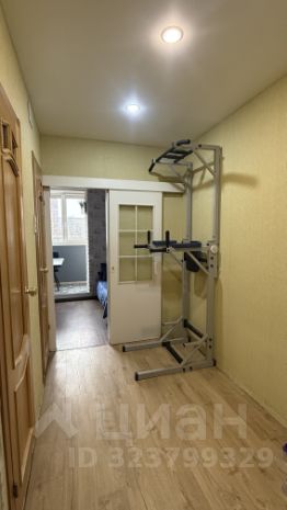 На входе просторная прихожка, где сейчас стоит турник, а при желании там можно разместить спальное место. По правую руку незаметно за белой дверью находится кладовка, в которой установлен стеллаж до потолка и сделана вешало под несезонную верхнюю одежду.