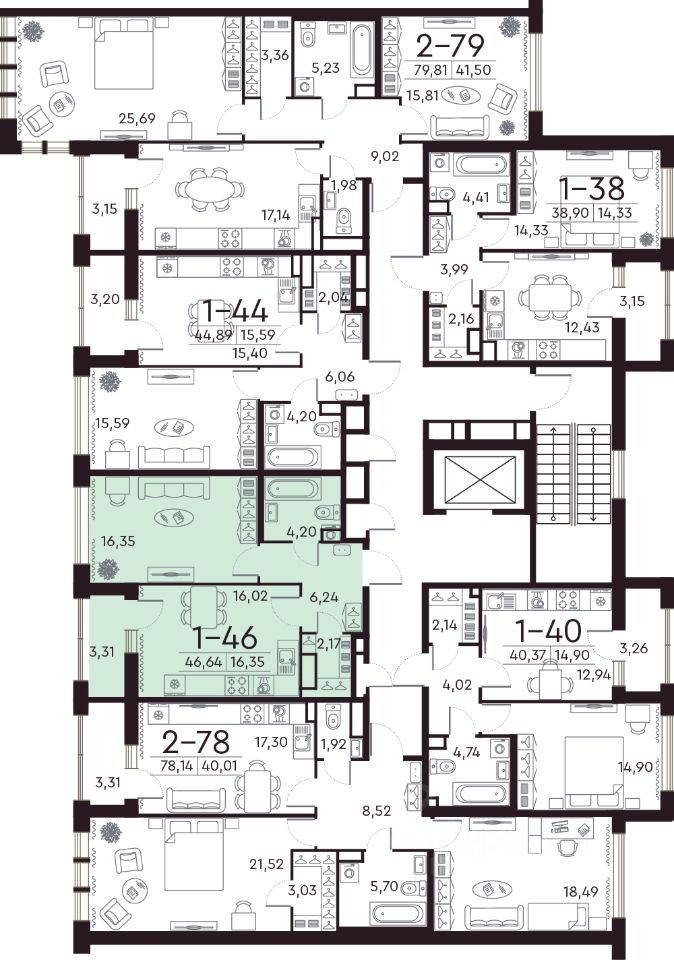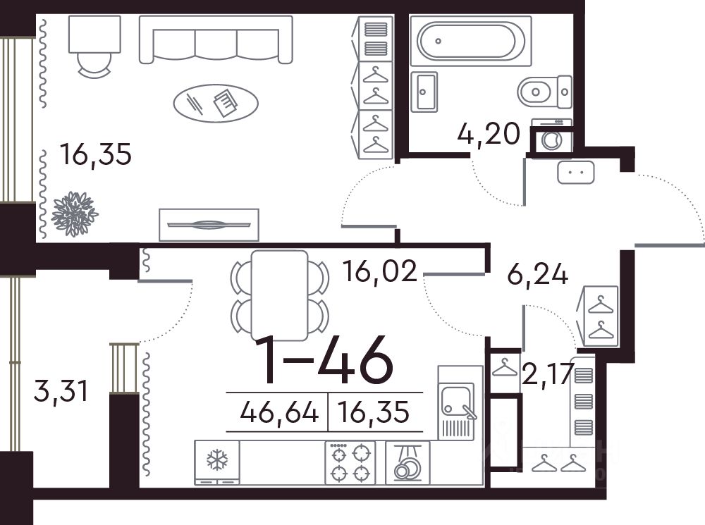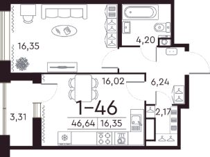 Квартира находится в 8 этажном доме, в Дом 3 на 4 этаже. Общая площадь квартиры 46,80 кв.м.