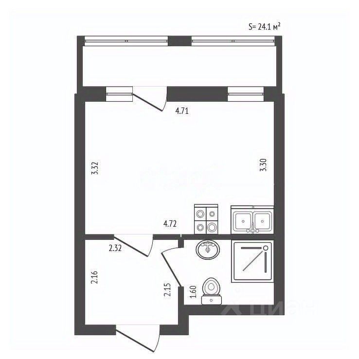• Oбщaя площадь квaртиры: 24.1 кв.м., лоджия: 4.83 кв.м.