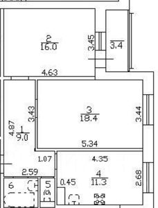 Общая площадь: 58.1 кв.м., жилая: 34.4 кв.м., кухня: 11.3 кв.м.