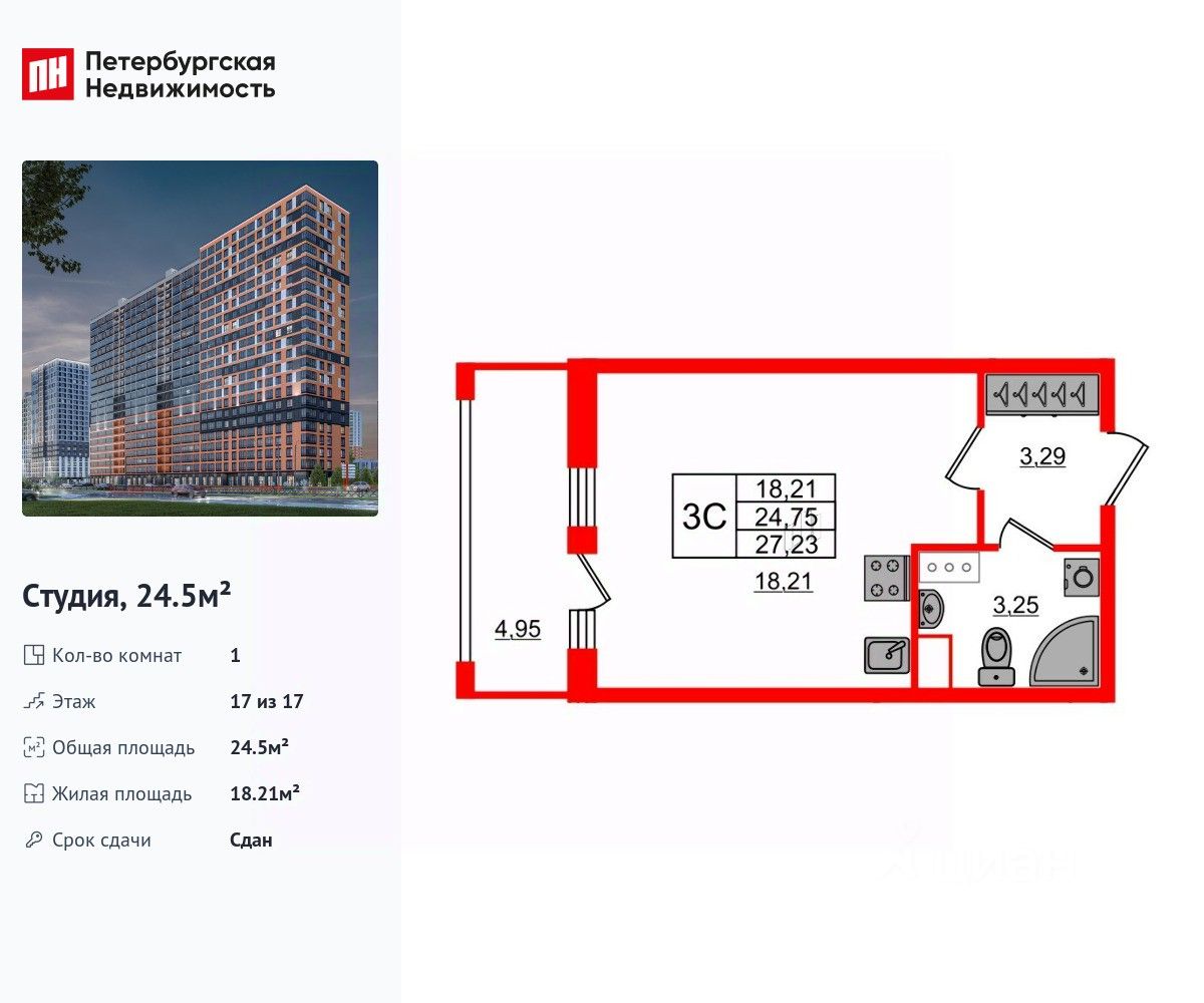 Удобная, классическая, функциональная европланировка, просторная прихожая 3.29 м². Общая площадь студии - 24.5 м², жилая 18.21 м², высота потолка 3 м.