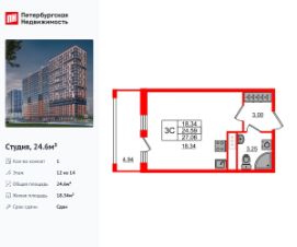 Удобная, классическая, функциональная европланировка, вместительная прихожая 3 м². Общая площадь студии - 24.6 м², жилая 18.34 м², высота потолка 2.77 м.