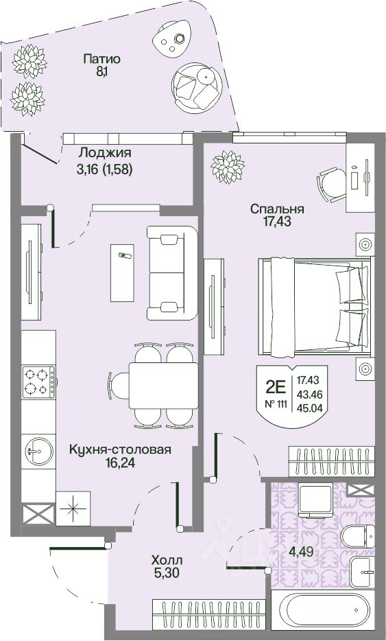 Продается 1-комнатная квартира с отдельным выходом в Патио 8,1 кв.м.
