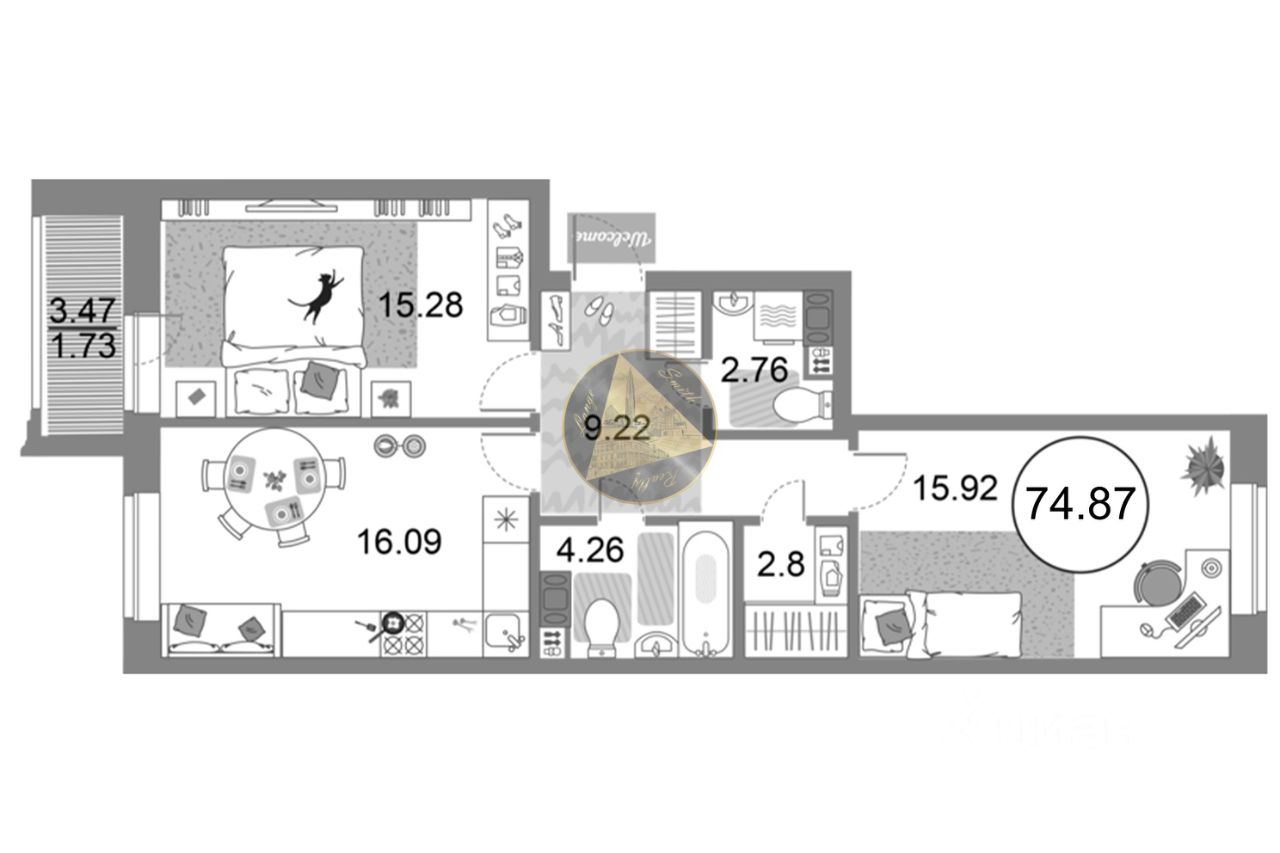Срочно продаётся 2-комнатная квартира общей площадью 74,87 м2. в Приморском районе Санкт-Петербурга. Квартира находится в доме комфорт-класса, оформленном в стиле античной эстетики. Идеальный вариант для тех, кто хочет жить в стильном доме в окружении природы.
