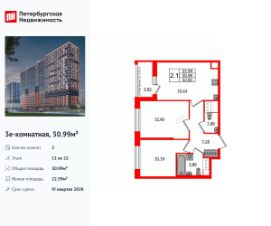 Удобная, классическая, функциональная европланировка, большая кухня-гостиная 15.43 м², вместительная прихожая 7.25 м². Общая площадь квартиры - 50.99 м², жилая 22.59 м², высота потолка 2.77 м.