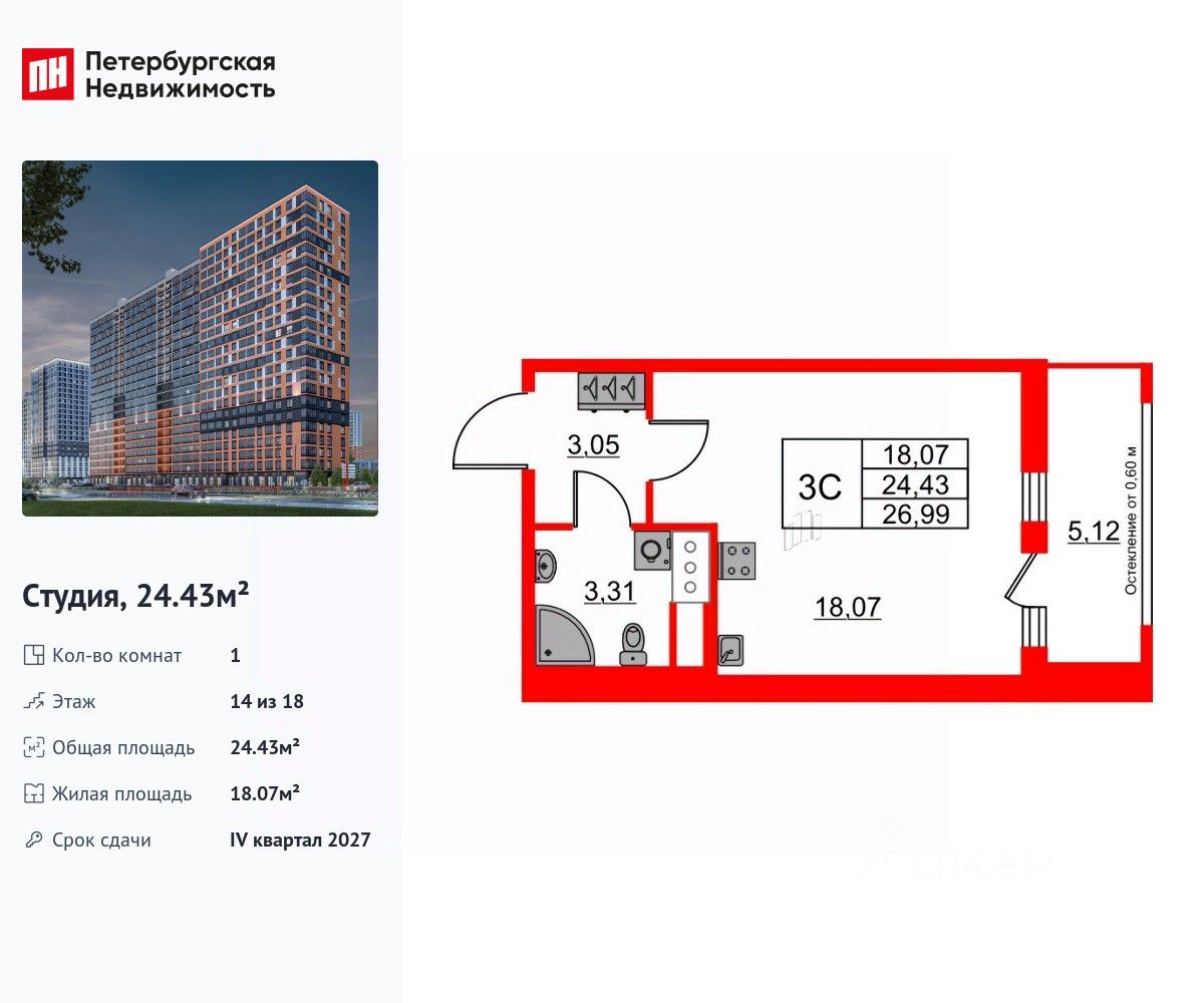 Удобная, классическая, функциональная европланировка, вместительная прихожая 3.05 м². Общая площадь студии - 24.43 м², жилая 18.07 м², высота потолка 2.77 м.