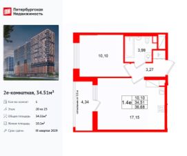 Удобная, классическая, функциональная европланировка, большая кухня-гостиная 17.15 м², вместительная прихожая 3.27 м². Общая площадь квартиры - 34.51 м², жилая 10.1 м², высота потолка 2.77 м.