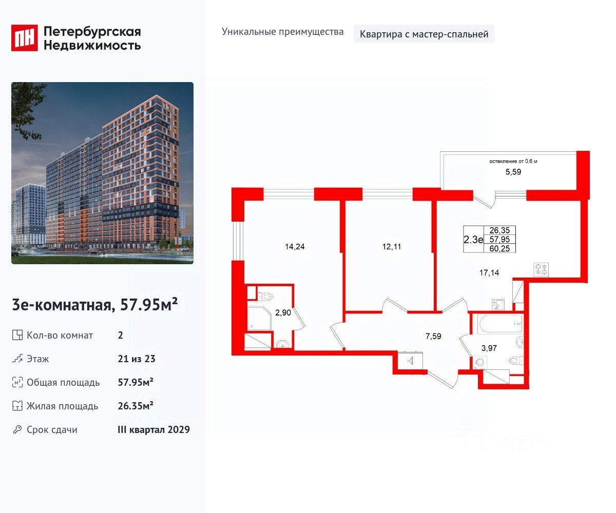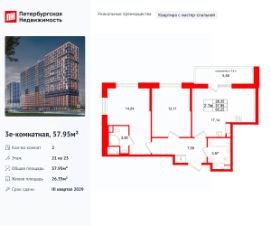 Уникальная, функциональная европланировка, большая кухня-гостиная 17.62 м², вместительная прихожая 7.61 м². Общая площадь квартиры - 57.95 м², жилая 26.35 м², высота потолка 2.77 м.